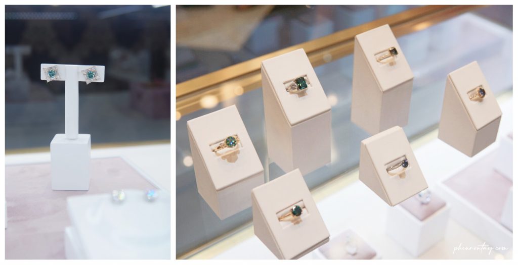Next and the most exciting part – selecting the gemstone. LeCaine offers a variety of quality moissanite. From the top-notch colourless grade to a wide array of different shades of green and grey. Knowing exactly what I wanted, we went straight to picking the coloured gemstone.