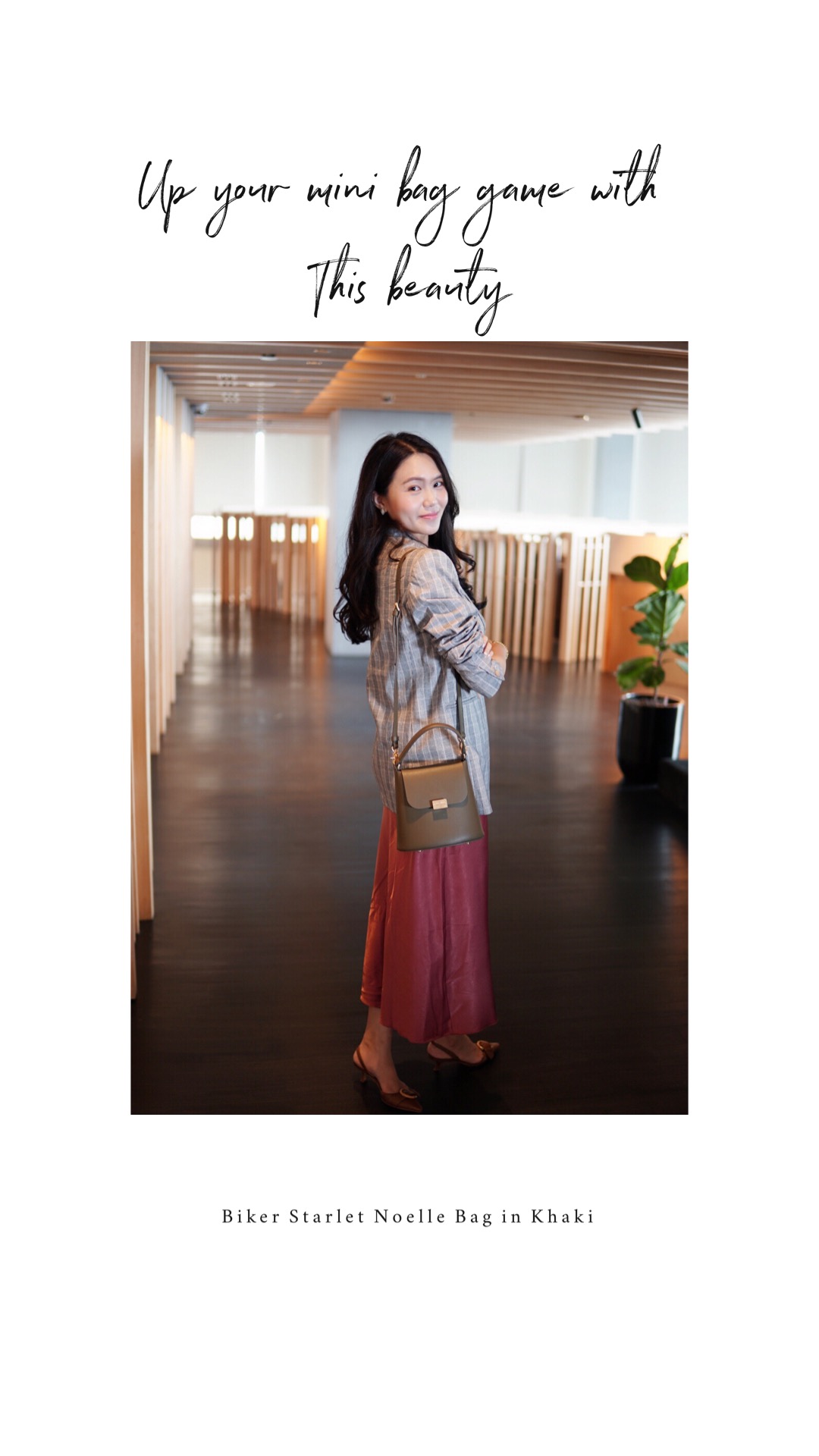 I brought the Noelle Bag out for the day. It comes in two sizes, the small and the original. Being a small bags collector, of course, I chose the small one. This design debuted in Spring 2018, and now it comes with a brand new, sophisticated Khaki colour to suit the late winter mood. The deep and solid green colour complements the slip dress from Klarra so very well, it lifted the holiday mood almost instantly.