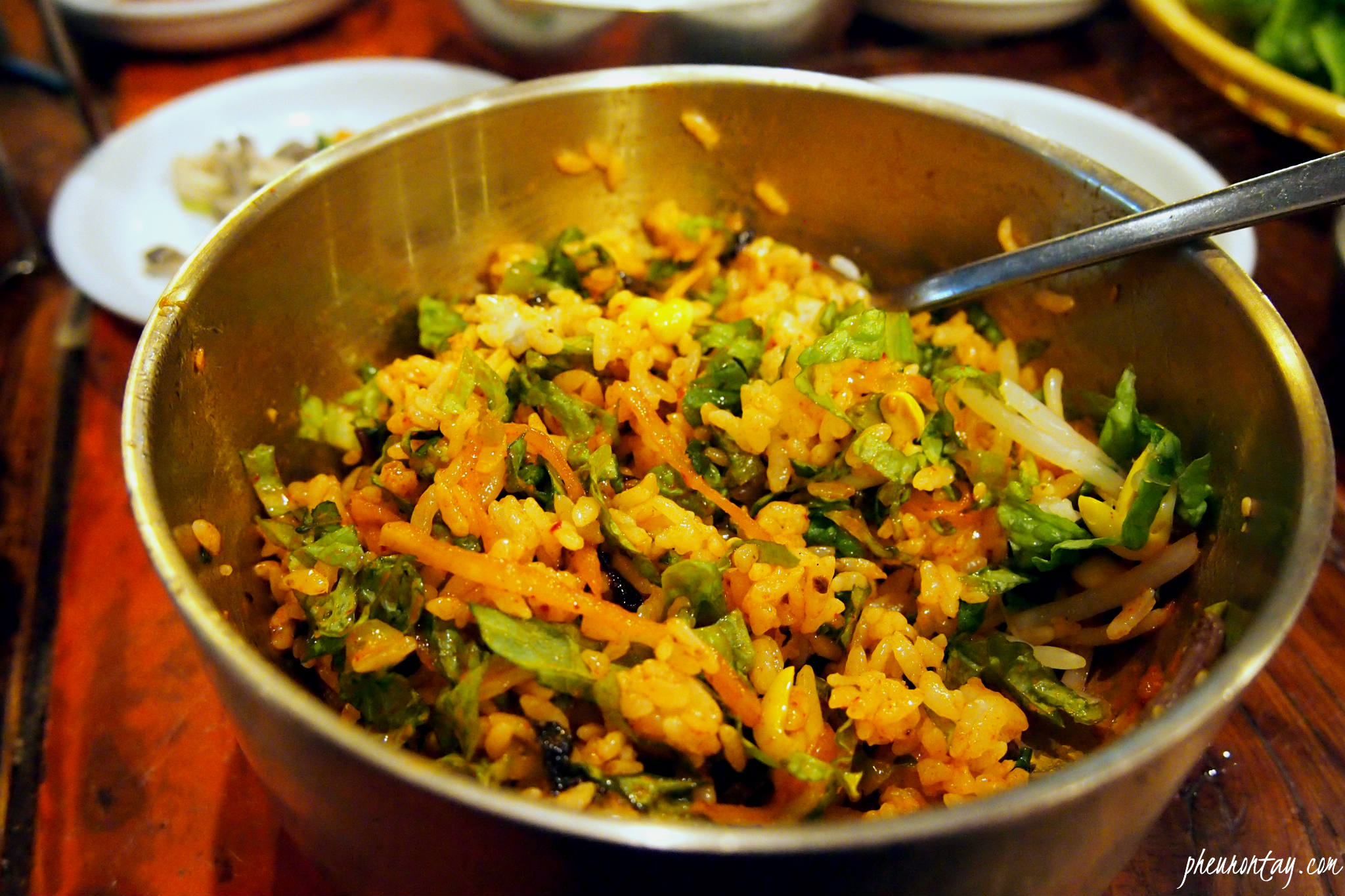 The restaurant provides 3 kinds of Bibimbap, the Yuk-hoe Bibimbap (육희 비빔밥) a kind of bibimbap with raw beef, or tartare instead of usual bulgogi; Dolsot Bibimbap (돌솥 비빔밥), which is served in hot stone pot, and Brassware Bibimbap (놋그릇 비빔밥), also called Jeonju Bibimbap which comes in muted gold colour tableware, and is said to be prepared based on royal court dish.