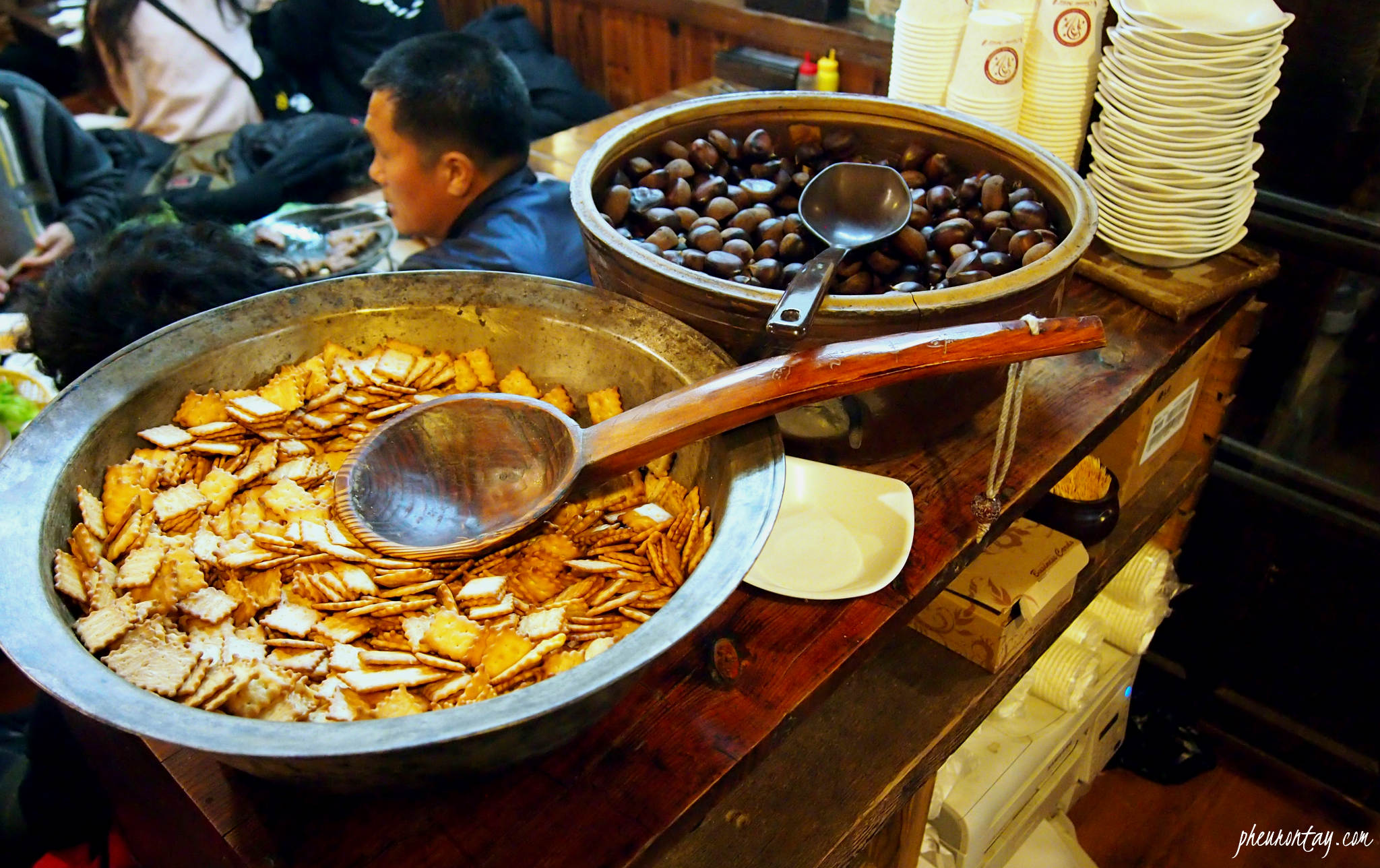 A Kal-guksu (칼국수 Knife Cut Noodles) house that started their business in 1977. Very similar to the Chinese刀削面, or what we call Ban-mian, this bowl of Kal-guksu is a popular dish at the Hanok Village, especially in the winter. Cooking method is quite identical to our Ban-mian: Noodles are thinly sliced from a dough and cooked in anchovies stock soup, add an egg, drizzle some chilli oil and dried seaweed, voila!  The shop offers man-doo (meat dumplings, KRW 4,000) as well. A relatively economical meal in Jeonju. Each bowl goes at KRW 5000.