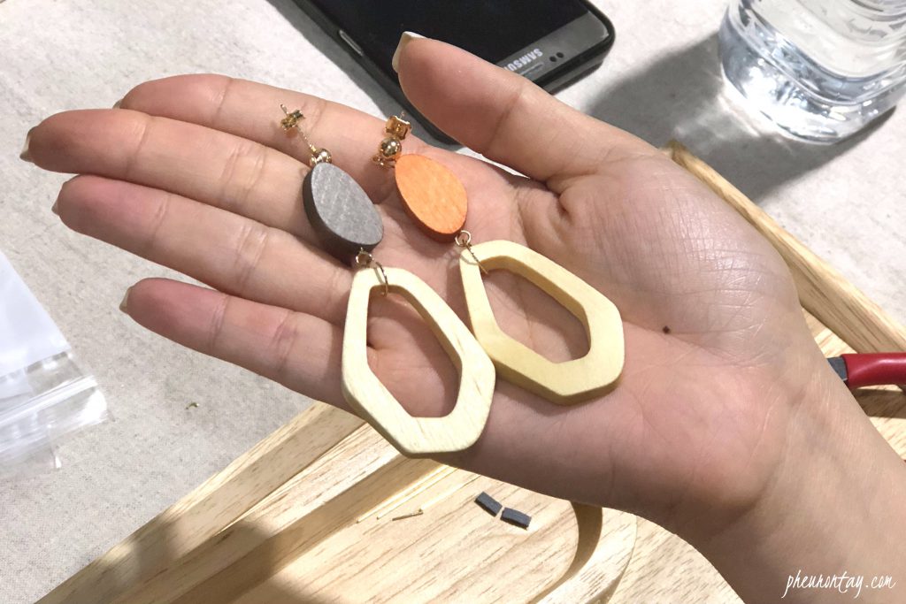 I was given a small tray upon arrival, with all things needed – several tweezers and a wooden holder where I can put all my selected materials in the later part of the class. The class covers basic skills like how to make simple jewellery clasps, closures, and connectors. By the 1 hour mark, I have got the basics and started working on my wood earring.