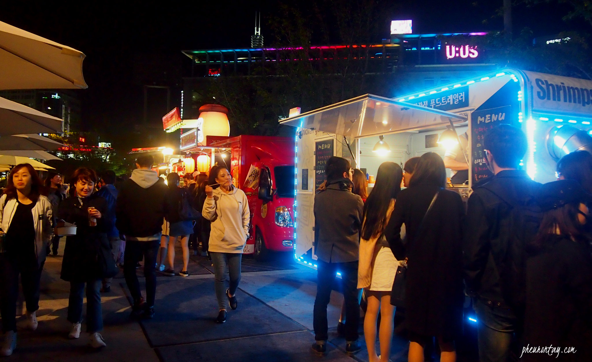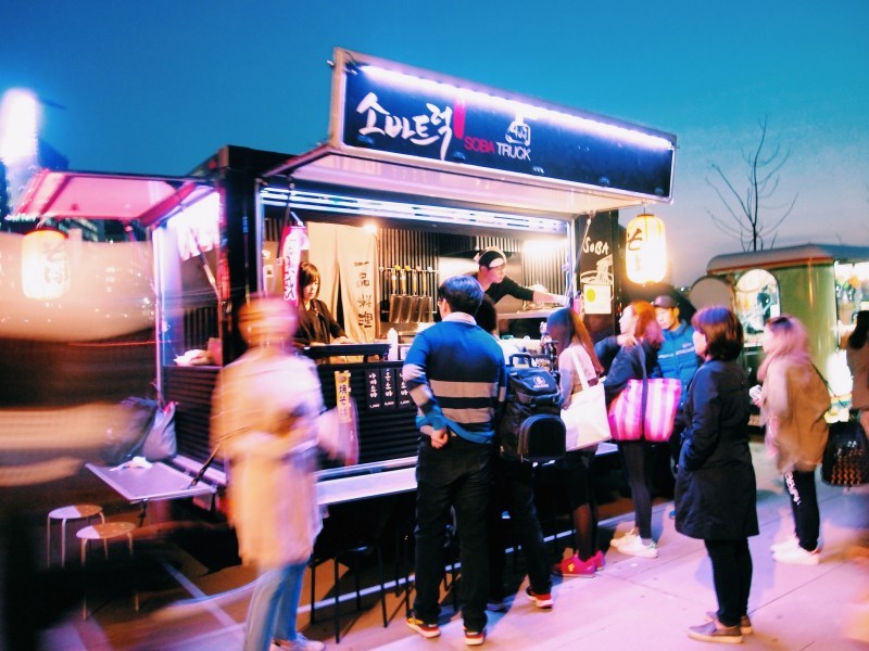 The food trucks selections are wide. Expect international dishes like shrimp pad thai, Mexican tacos, English fish & chips, sandwiches, grilled lobsters, churros, hot dogs as well as Korean street food such as mandoo, ddeokbokki, and king sized bulgogi stick. The license to sell food here isn’t easy to obtain either. According to an egg benedict truck owner, all of these vendors went through several rounds of interviews before given a green light to do business there.