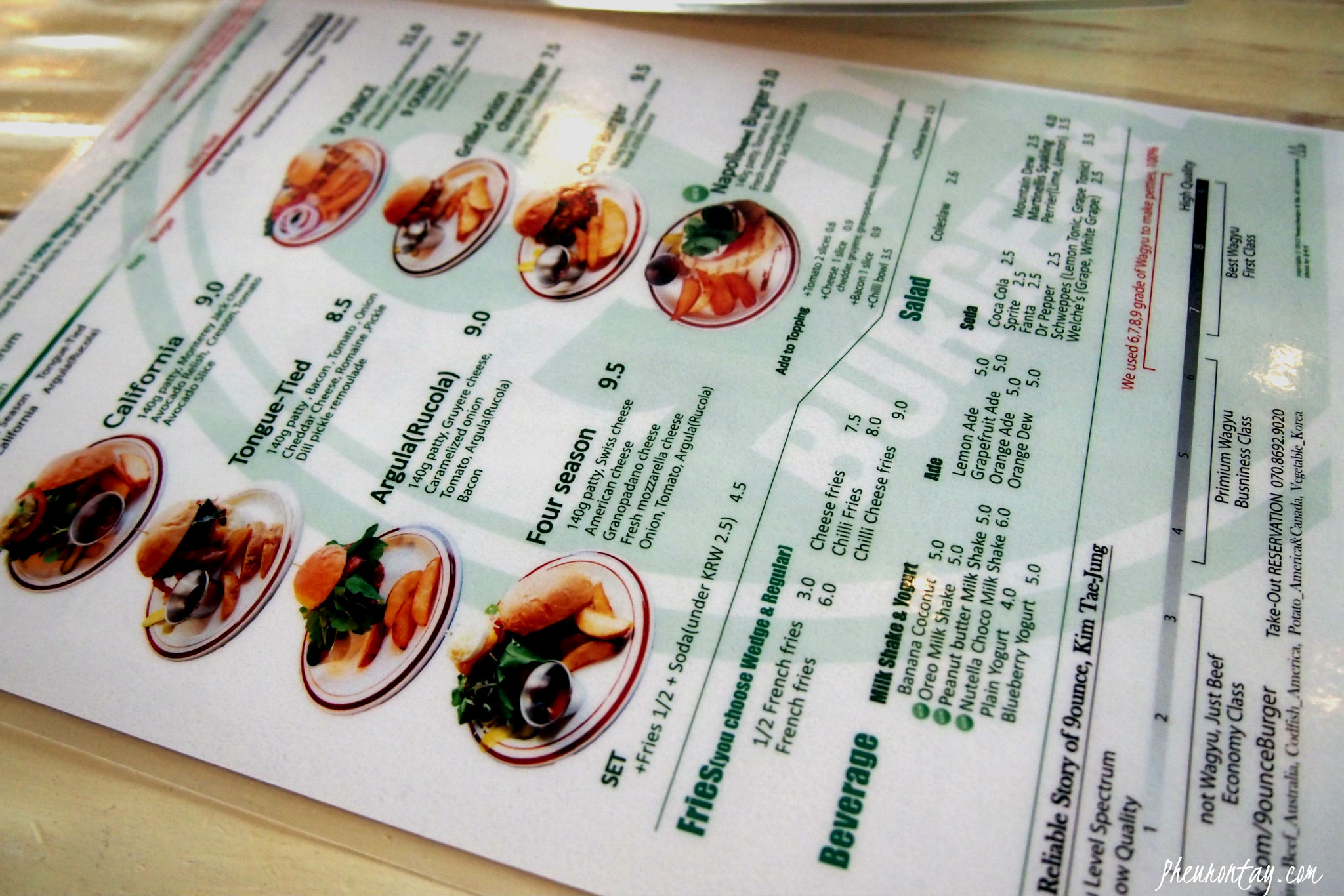 You are given eight types of burgers to choose from — which I think the choices available is pretty decent for a small burger chain like this. You may choose to have ala carte (only the burger) that cost you KRW8,500-9,500 (OMG I AM SO HAPPY WITH THIER PRICING), or add another KRW4,500 to complete a meal (meals come with bigger serving of fries and a soda). English Menu is available. HOORAY!