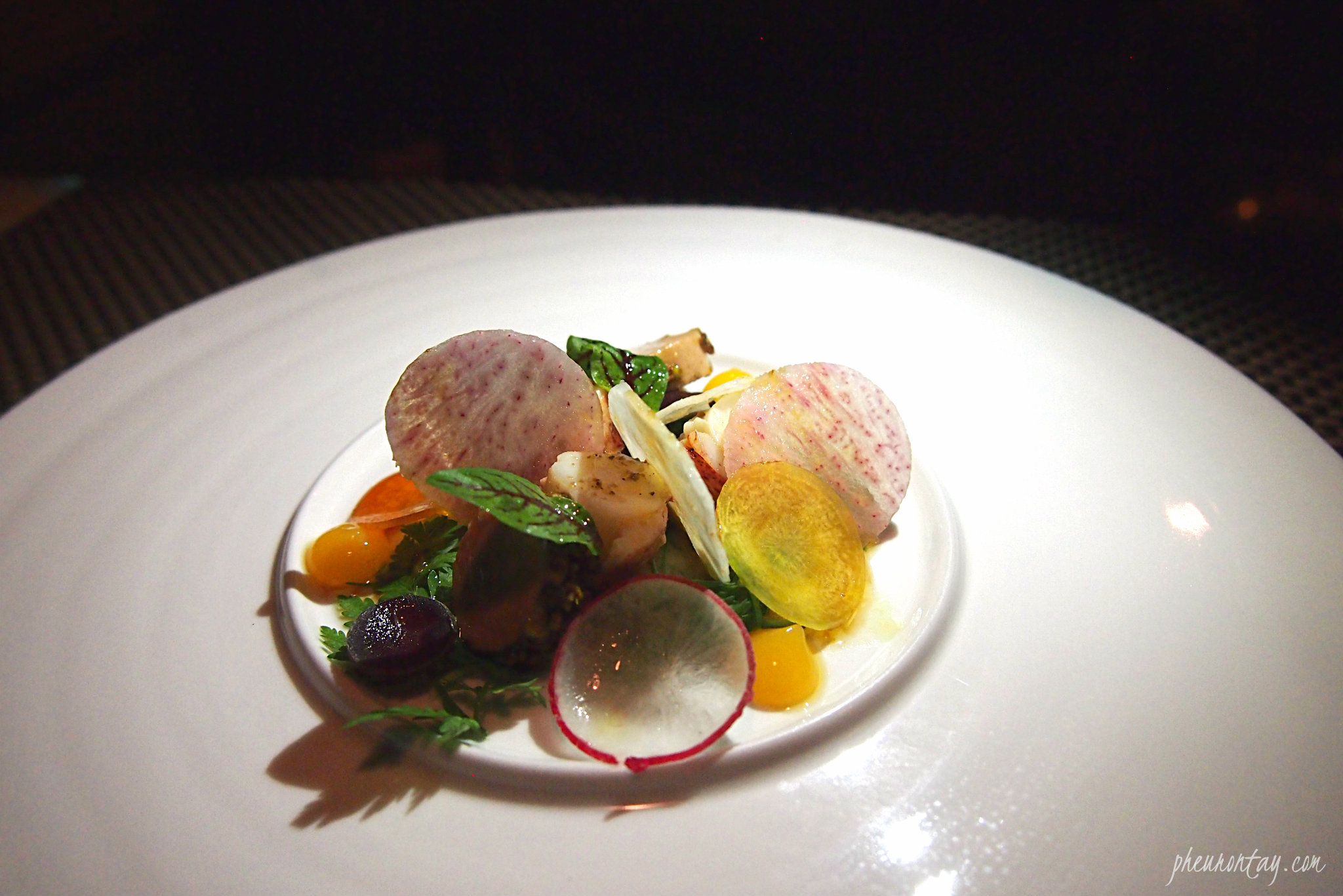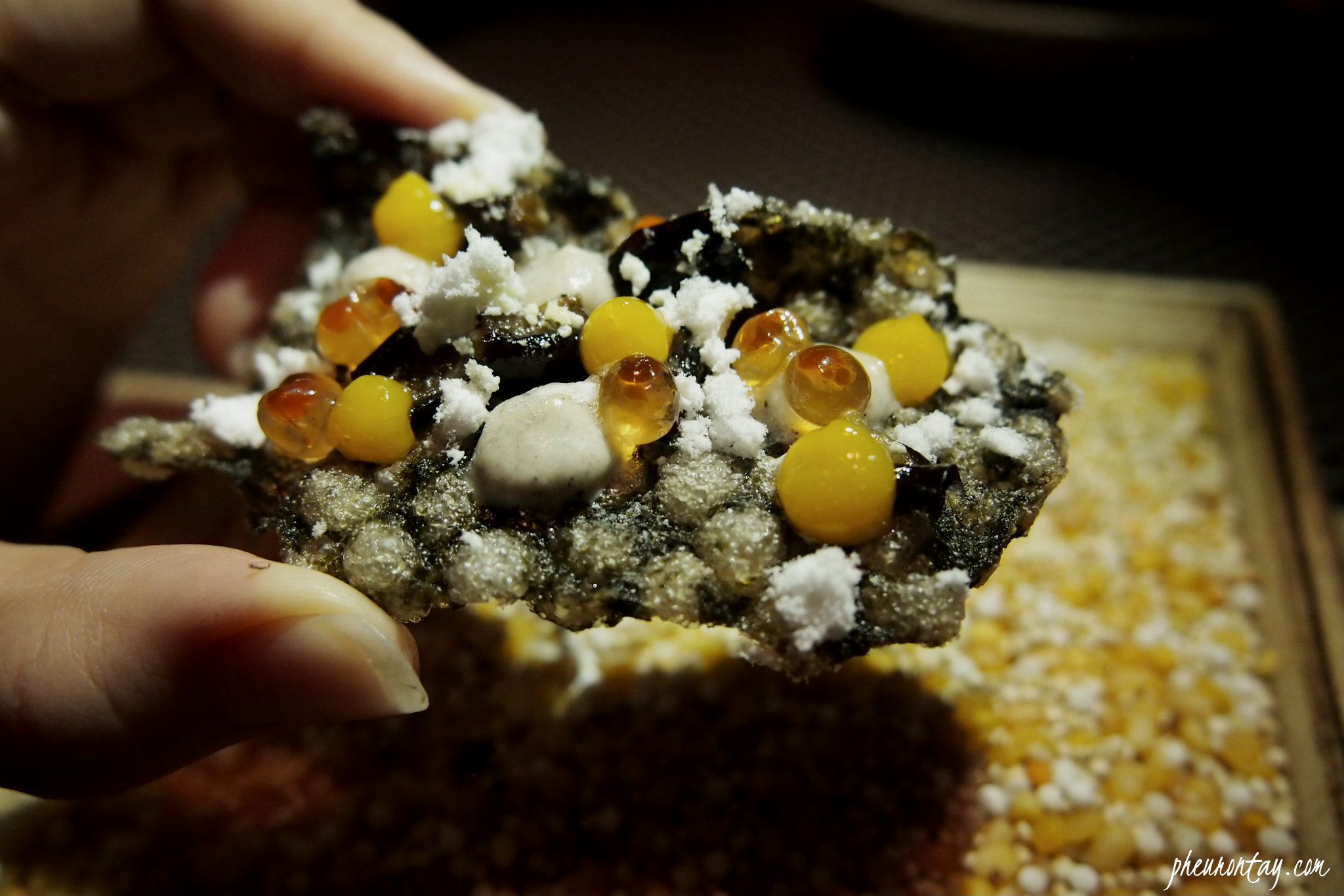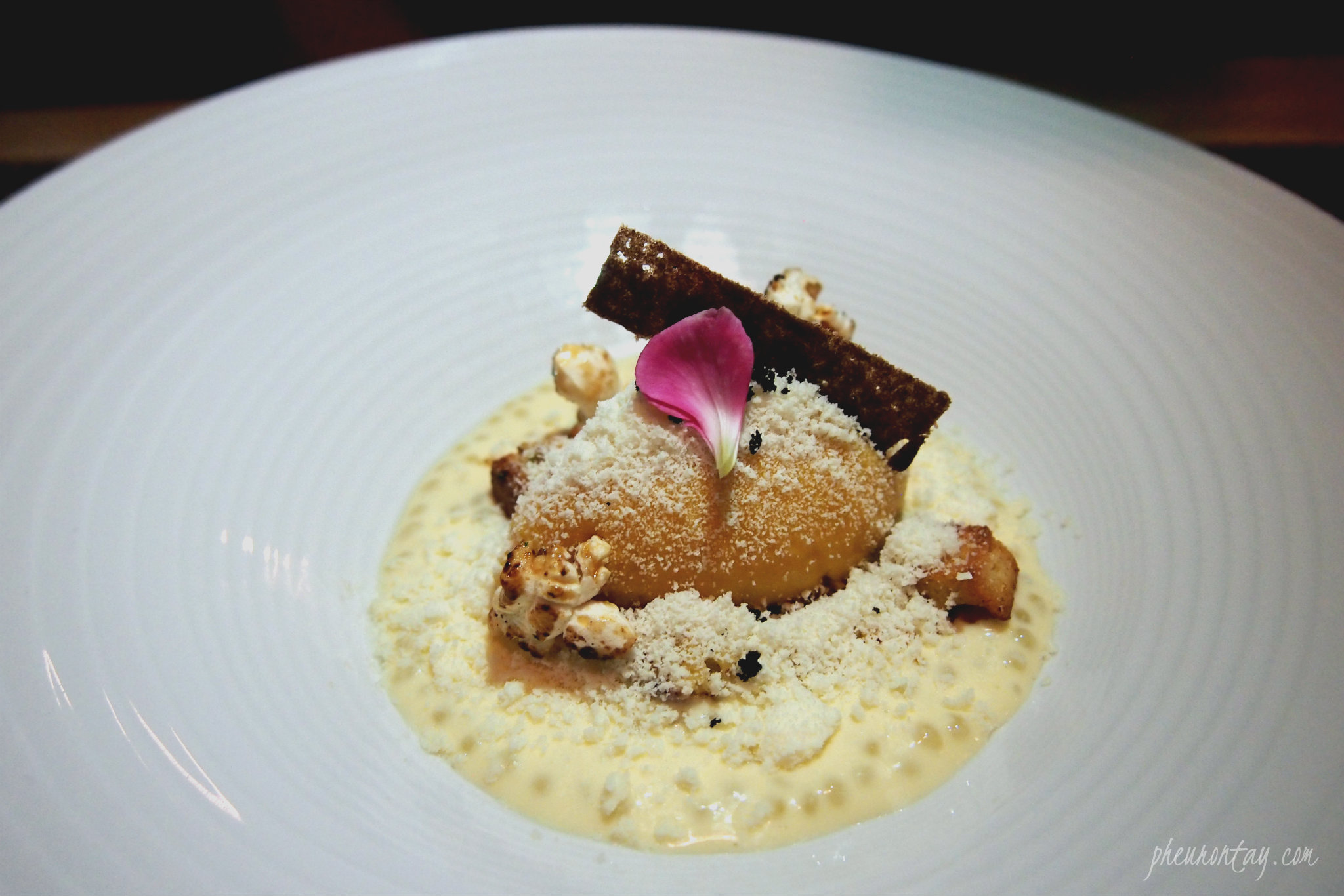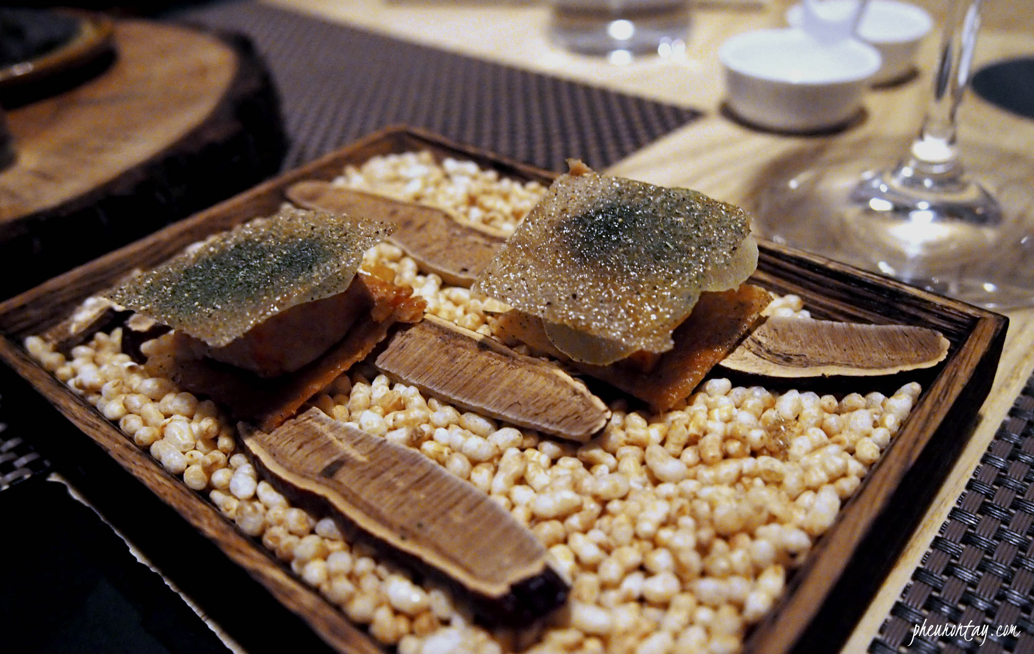 Up next were two dishes grouped under Eggplant. The eggplant custard, eggplant caviar, shrimp and vanilla dumpling were soul-warmingly good but the eggplant chip was the game changer. Sliced to paper-thin, the eggplants are coated with batter and deep fried, then topped with salmon roe for that extra juiciness and moist that pops in your mouth. The passion fruit sauce adds a pleasing fruity hints and notes of luscious foie gras sauce packs a lot of punch.