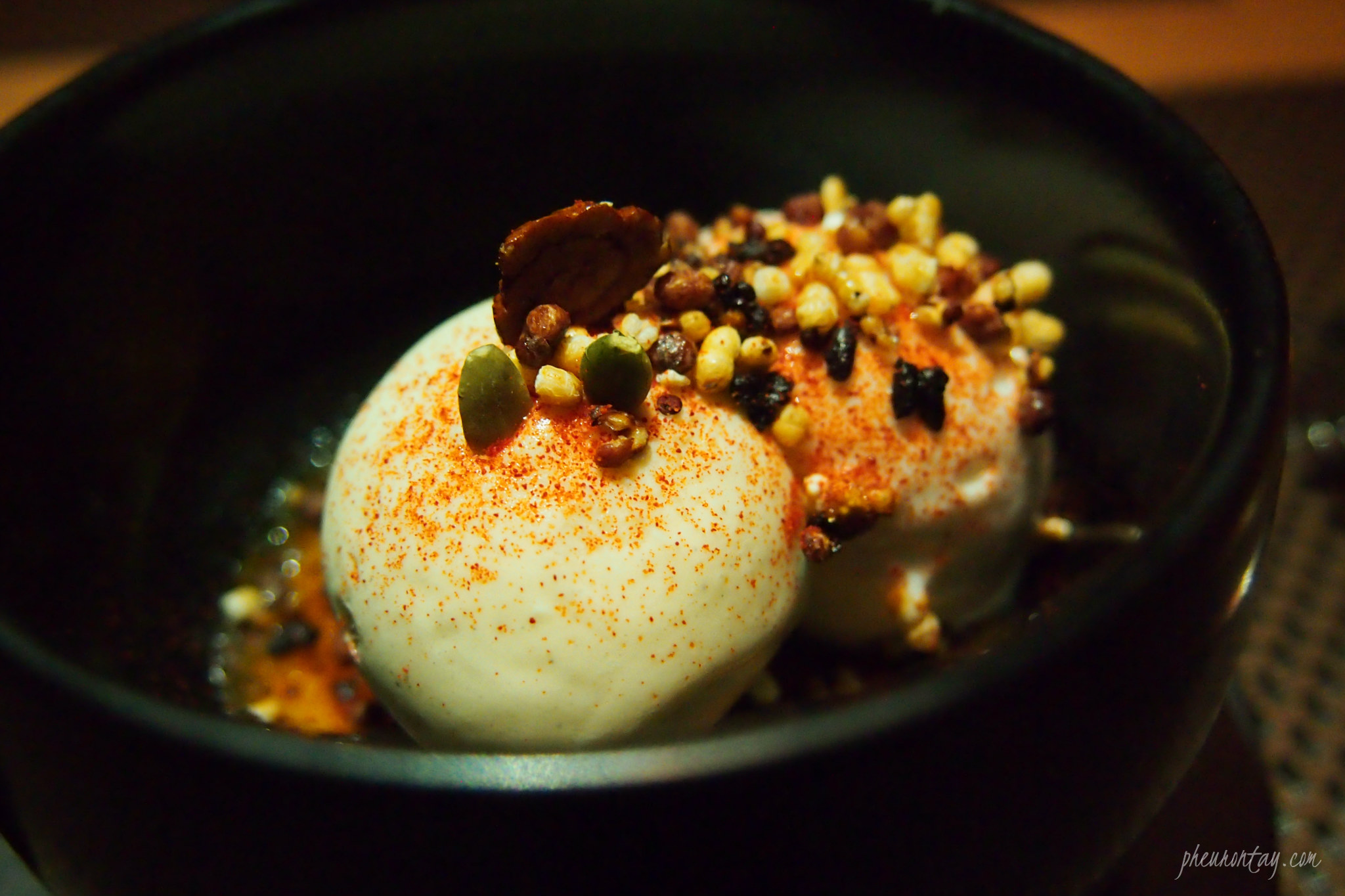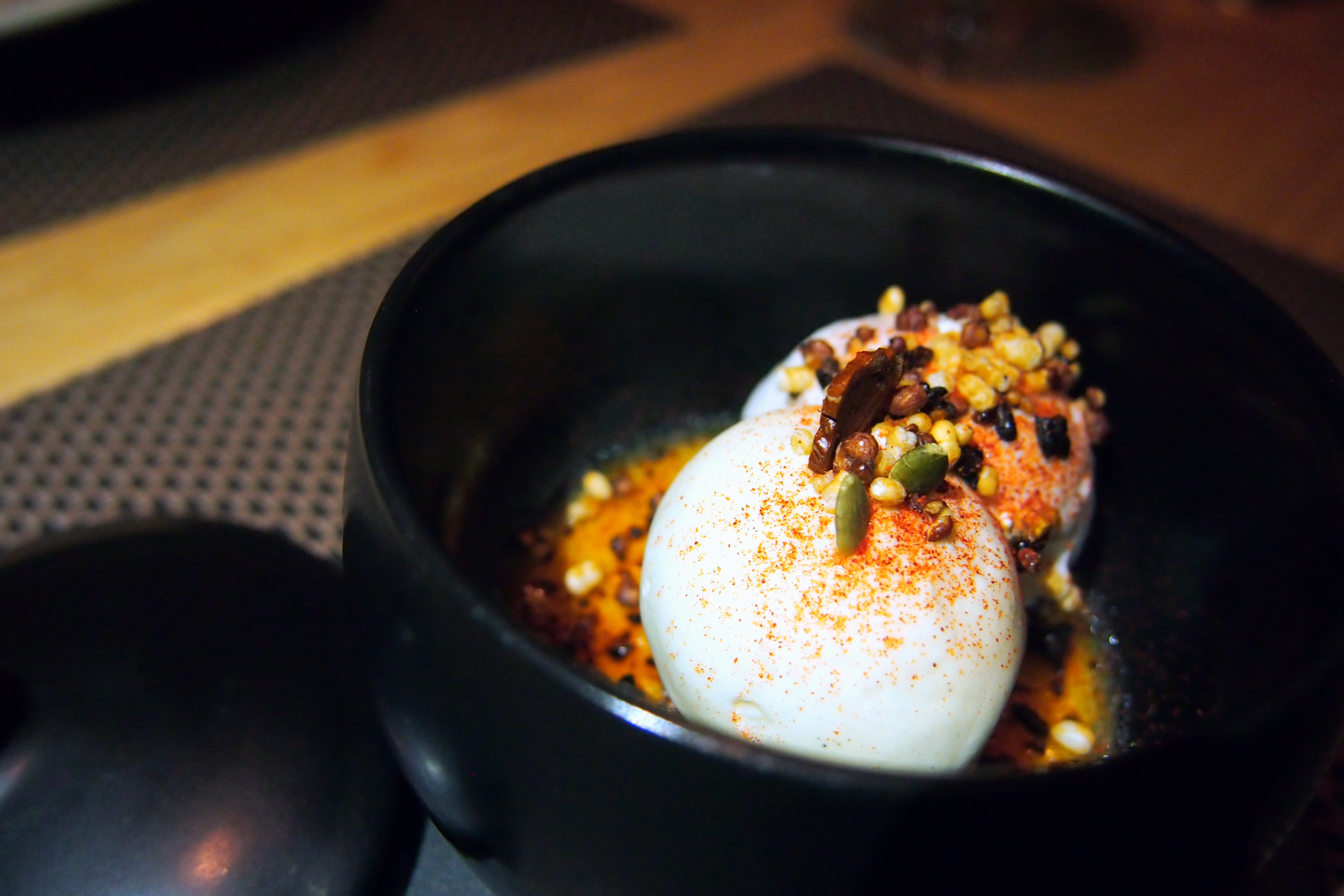 My pick for dessert was the Jang Trio – Strange as it may sound, 3 types of the most important condiments in Korean culinary are used in the dessert. Doen-jang (soy bean paste) cream brΓ»lΓ©e, topped with vanilla ice-cream, then sprinkled with some Gan-jang (soy sauce) pecan and Gochujang (chilli pepper) grains, and finish off with whisky foam.