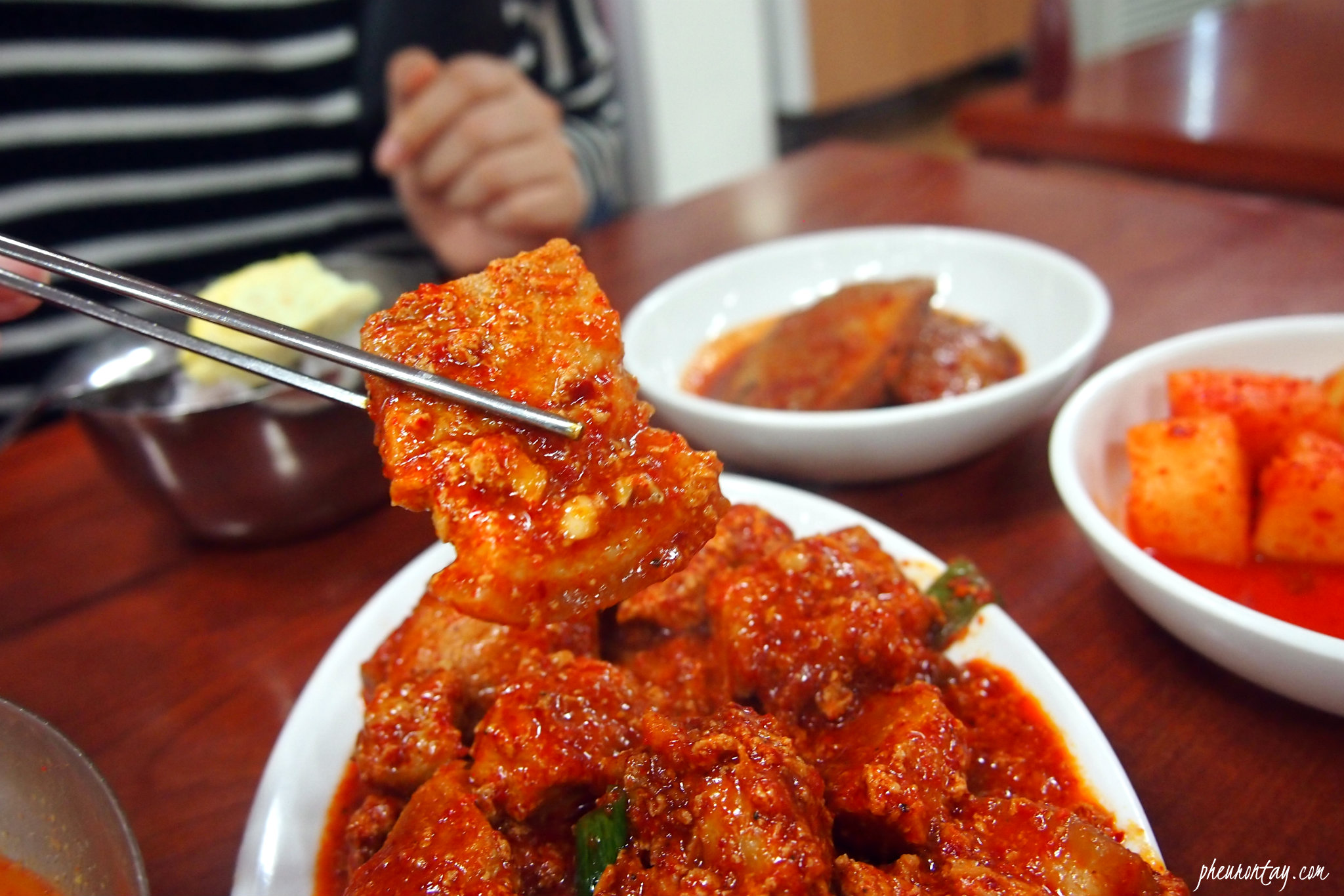The garlic-y spicy gravy is the highlight of the meal. I have no idea what exactly they do to the red Yangnyeom gravy but it was downright delicious. Please be sure to scoop a generous portion of the gravy onto the rice, and have some seaweed ready for wrapping.