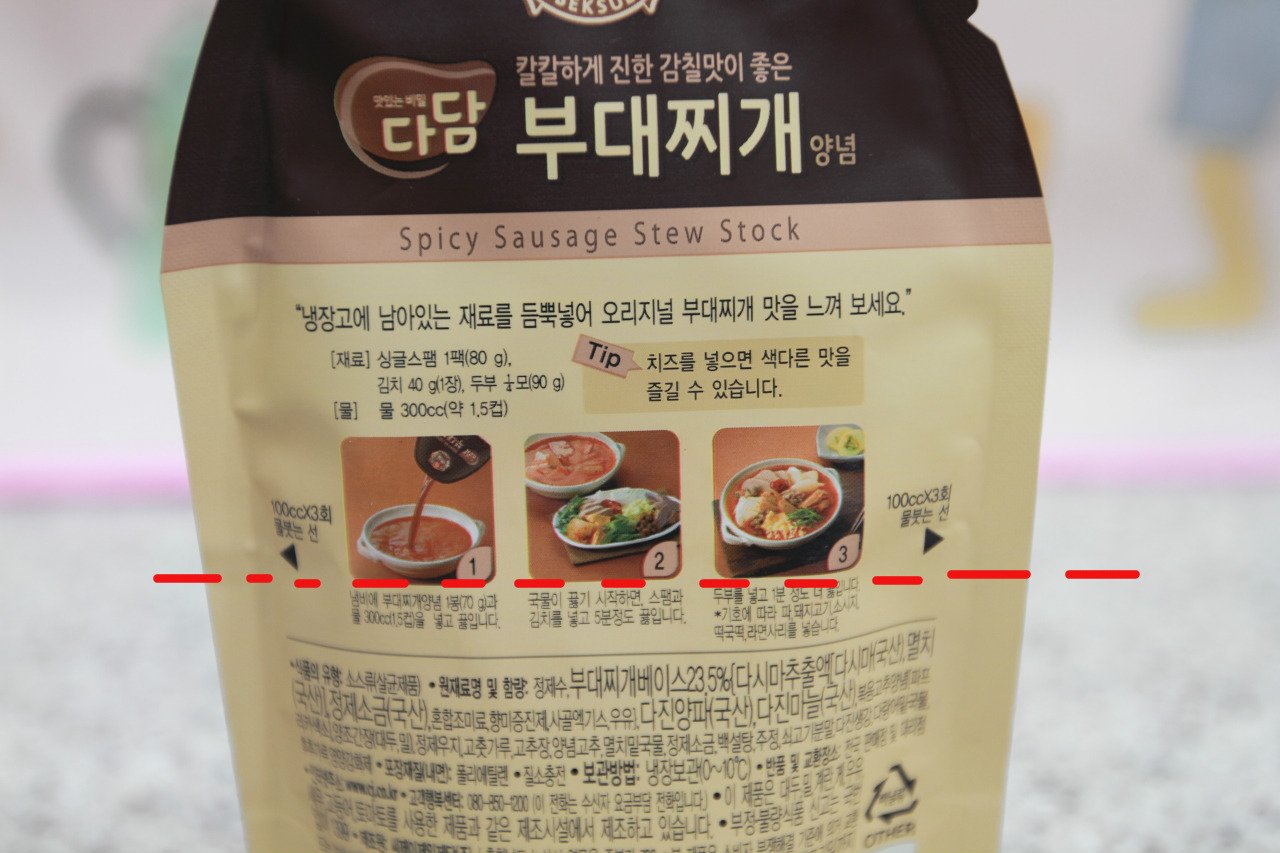 Add the stock paste to the pot. Then use the empty Baek Sul stock packet to measure 3 packets of water (300cc), pour them into the pot and cook. Notice there’s a marker at the back of the stock packet โ—„100 cc x 3ํšŒโ–บ, use that to gauge.